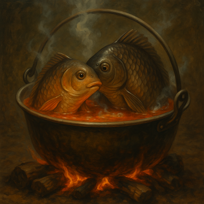 Az üstben szerelmet vall't párjának egy hal kan.